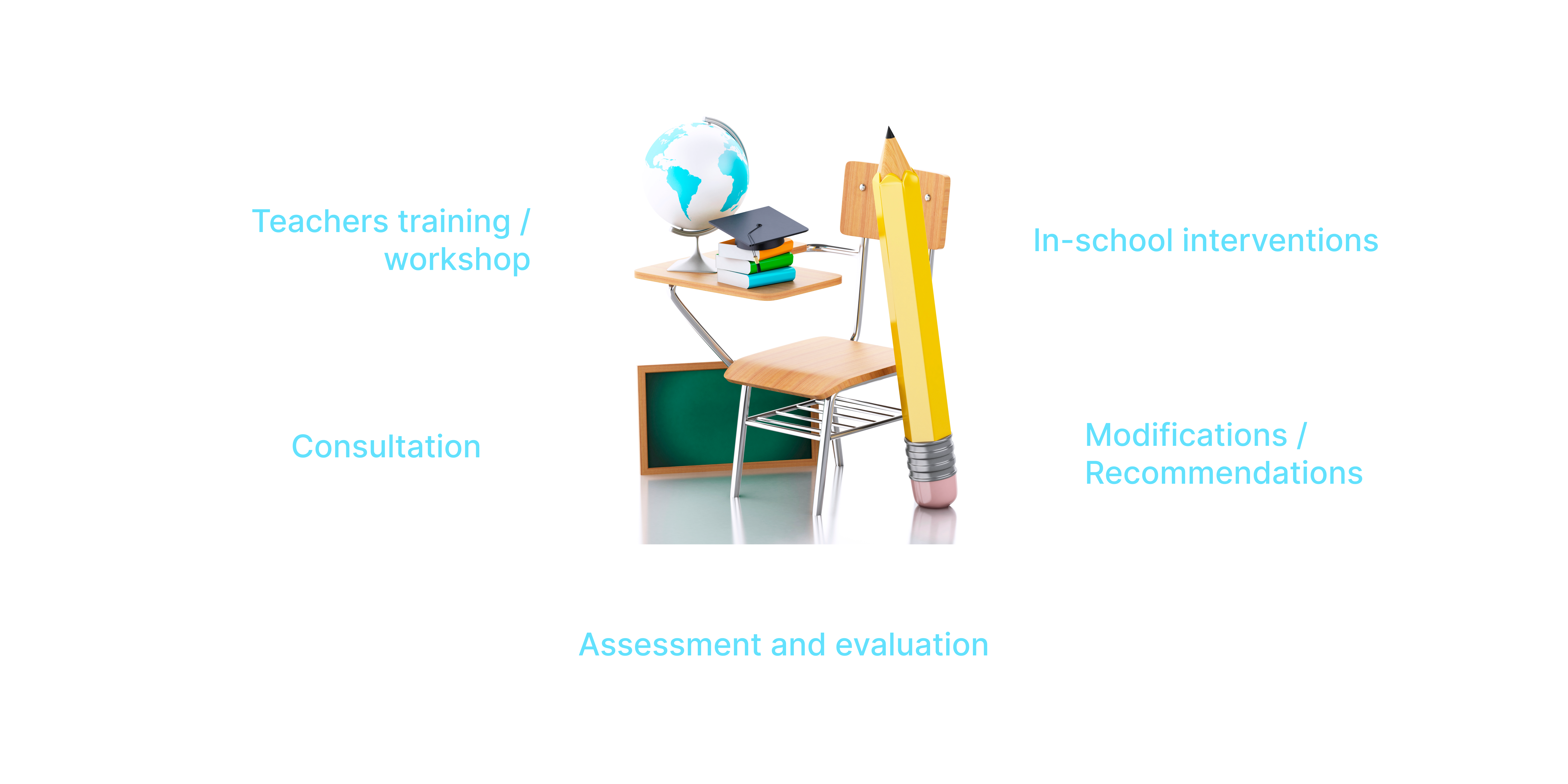 Our therapists provide specialised services for schools that may require services for their children and/or academic staff. Among the services include: